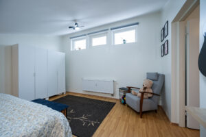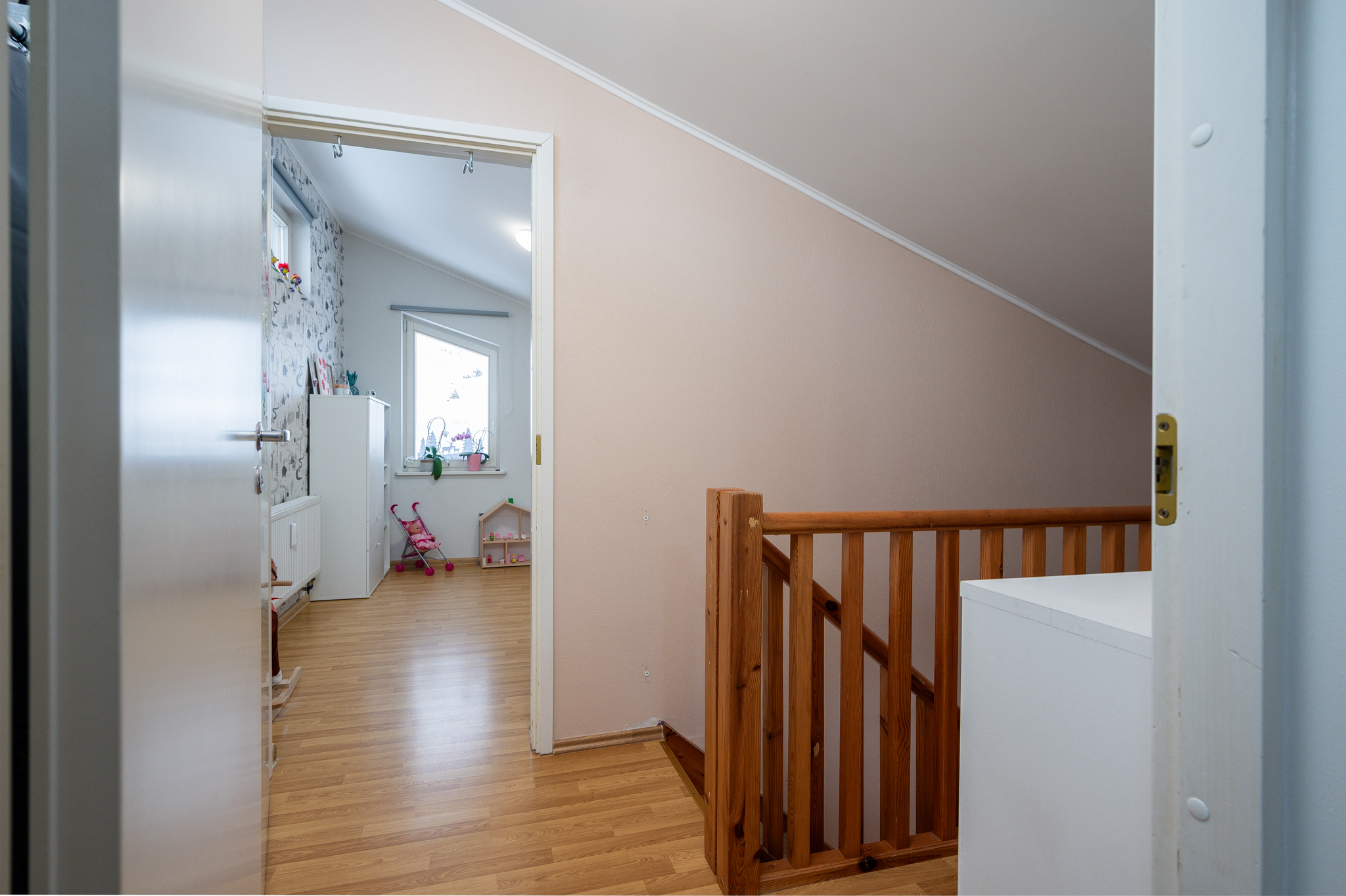 Korteri planeering on praktiline ja avar. Tänu akende paiknemisele on eluruumid päikesevalgusega hästi kaetud kogu päeva vältel – alumine korrus saab päikesevalgust pärastlõunal, ülemised toad hommikupoolikul.
