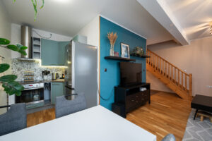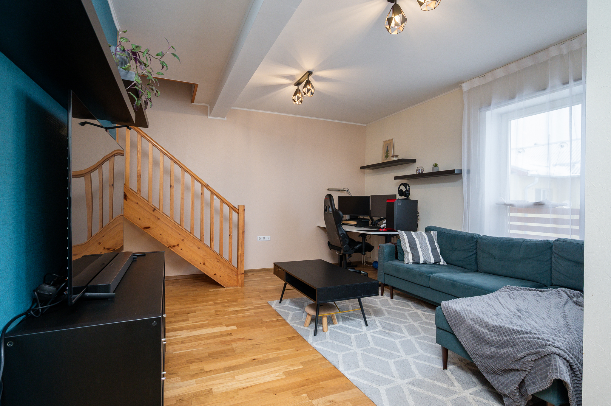 Korter asub kortermaja 3 ja 4 korrusel ning on jaotatud kahele tasapinnale, pakkudes eraldatust elu- ja puhkeala vahel. Alumisel tasandil paiknevad esik, elutuba, köök, vannituba koos wc-ga ning boonuseks rõdu. Ülemisel tasandil on kaks magamistuba ja väike vaheala trepi juures.